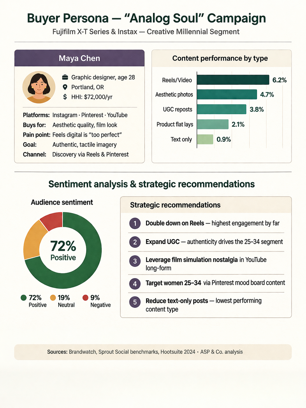 Reels drive the highest engagement at 6.2%, followed by aesthetic photography (4.7%) and user-generated content reposts (3.8%). Text-only posts bottom out below 1%. Brandwatch sentiment data shows 72% positive conversation, clustering around “film look,” “nostalgia”, and “creative community,” while 9% negative sentiment centers on X-series price point friction. Sprout Social’s 2024 benchmarks note that brands prioritizing UGC amplification see up to 34% greater social conversion than those relying on branded content alone.
